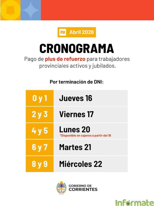 Entre este jueves 16 y el miércoles 22, los agentes de la administración pública provincial, activos, jubilados y pensionados, percibirán el Plus de Refuerzo de $100 mil por beneficiario, correspondiente a abril. Este beneficio forma parte, junto con el Plus Unificado (Adicional Remunerativo Mensual) y el sueldo, del Ingreso Salarial Mensual que paga el Gobierno de Corrientes.