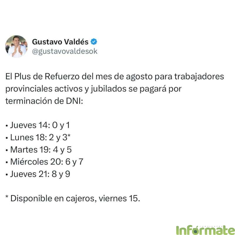 A través de sus redes sociales, @gustavovaldesok, el primer mandatario de Corrientes Gustavo Valdés informó el cronograma de pago del Plus de Refuerzo de $100.000, correspondiente a este mes de agosto. La liquidación del beneficio salarial comienza este jueves 14 y se extiende hasta el 21 próximo.
