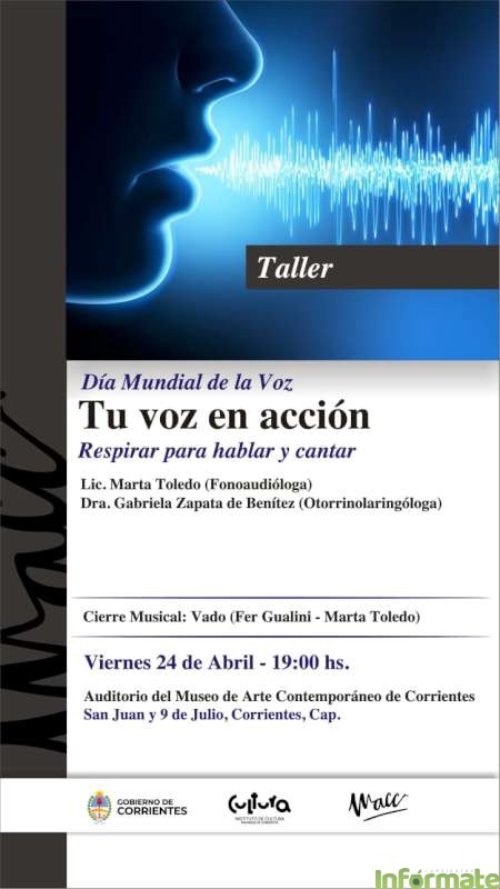 En el marco del Día Mundial de la Voz, el Instituto de Cultura de Corrientes invita al taller “Tu voz en acción: Respirar para hablar y cantar”, que se llevará a cabo el viernes 24 de abril, a las 19, en el Salón Auditorio del Museo de Arte Contemporáneo (4º piso del MACC), ubicado en San Juan y 9 de Julio. La actividad es gratuita y abierta al público.